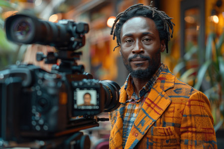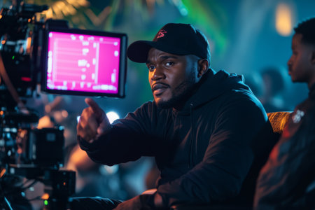 Music Video Director Male African-American Young Adult Directing and producing music videos in Film set. Generative AI AIG22.