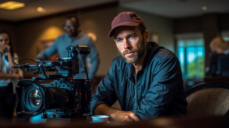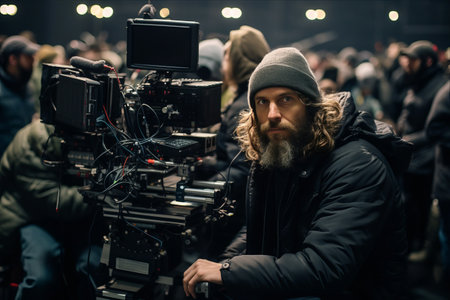 Skilled Man cameraman filming. Cinema tv set. Generate Ai