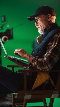 Prominent Successful Director Sitting in a Chair on a Break and Using Laptop Computer. On the Studio Film Set with High-End Equipment Professional Crew Shooting High Budget Movie