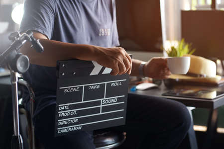 producer or cameraman sit on Bar Chair and holding clapper cinema board or Slate film and drinking morning coffee.Coffee break at studio