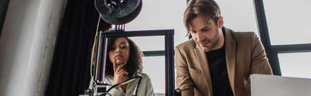 low angle view of young interracial designers working with 3D printer in modern office, banner