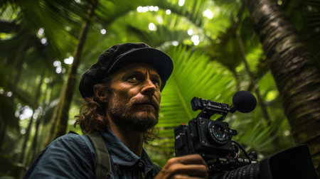 Filmaker or man vlogging or creating content. Videographer working and exploring