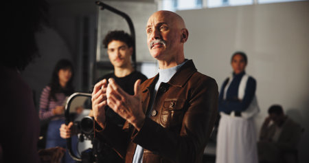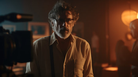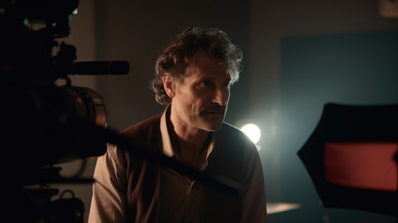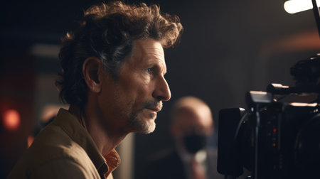 Music Video Director Male Caucasian Middle-Aged Directing and filming a music video in Film studio. Generative AI AIG22.