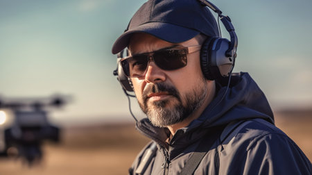 Man pilot launches drone into sky. Radio control of drones. Generative AI