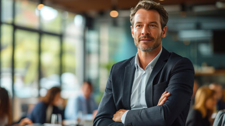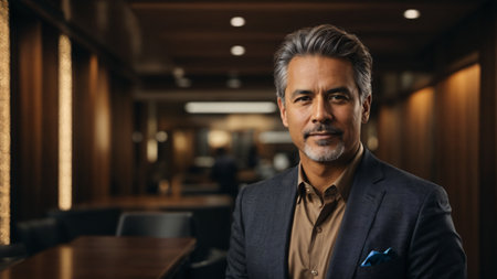 Confident executive man in his 50s showing leadership and business acumen in a corporate setting.
