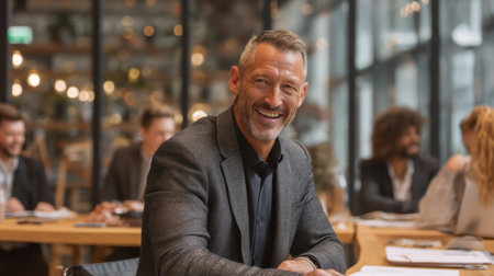 Smiling man stylish suit sits table modern office environment, surrounded by colleagues engaged discussions. atmosphere is lively and collaborative, showcasing teamwork and professionalism