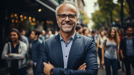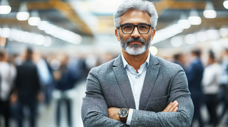 A confident businessman in glasses and gray hair stands with arms crossed, exuding professionalism in a bustling corporate environment, symbolizing leadership and experience.