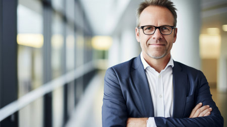 A confident, happy mid-aged older businessman executive standing in a bright modern office, reflecting leadership, expertise, and career achievement while embodying professional excellence and