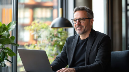A confident man with glasses sits at a sleek desk, working on his laptop and enjoying a moment of focus in a stylish, well-lit workspace surrounded by greenery.