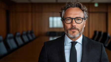 A mature businessman with glasses and a grey beard sits confidently in a modern conference room. His professional appearance and composed expression convey experience and leadership in the corporate world.