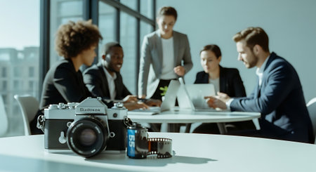 A group of professionals in a meeting with a camera and film roll on the foreground table, laptops and papers on the background table, in a modern office setting with large windows.