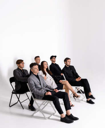 Portrait of a group of stylish people in white suits. A group of businessmen in white suits.