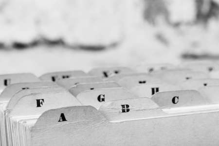 Close up of an old, index tabbed address book with yellowing and furled pages, placed on a wooden table with light coming from left of frame and some shadow to the right.