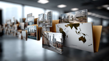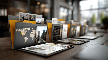 This image captures a vibrant workspace featuring digital devices and organized folders filled with maps and city photographs, inspiring creativity and productivity.
