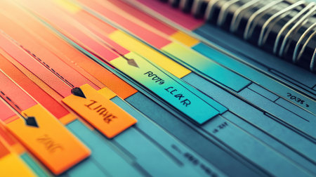 A vibrant arrangement of file tabs in various colors alongside a lined notepad on a desktop, showcasing an organized approach to office management and productivity.