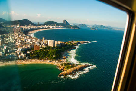 Aerial view of famous Copacabana Beach and Ipanema beach in Rio de Janeiro, Brazil. Beautiful top view of the sea and the beach.