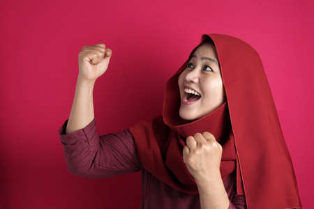 Portrait of success beautiful Asian muslim woman wearing hijab showS winning gesture, excited happy expression celebrating victory, against red background