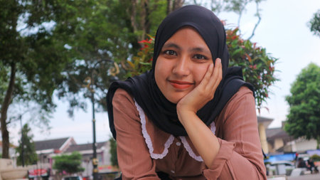 Portrait of smiling young Muslim woman in hijab in the city park looking at the camera while propped her chin. relaxing islamic girl at park.