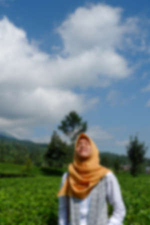 Blur photo of asian couple on vacation in tea garden