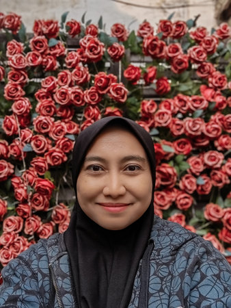 Woman wearing hijab portrait on red roses wall background flowers.