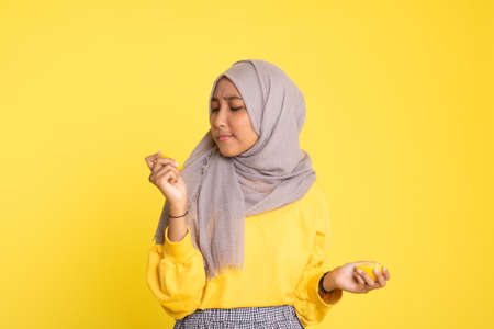 Close up of Asian muslim teenage girl wearing yellow hijab looking up and thinking, half face portrait with copy space above, against red background