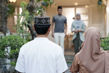 muslim family coming back home and shake their parents hand