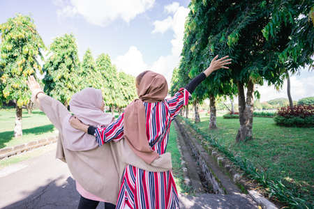 two happy muslim friend taking selfie or video calling outdoor using her smart phone during sport break outdoor