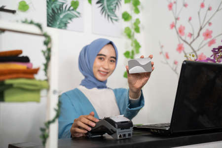 a veiled business woman smiles holding a credit card and an Electronic Data Capture Machine while sitting in front of a laptop computer at a checkout in a boutique shop