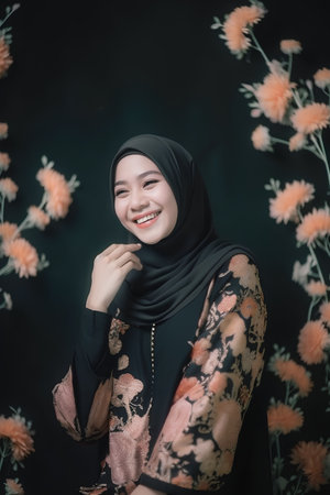 Beautiful asian muslim woman wearing hijab with flower background.