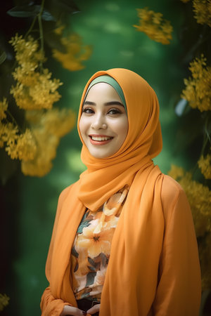 Portrait of beautiful muslim woman wearing hijab with yellow flower background
