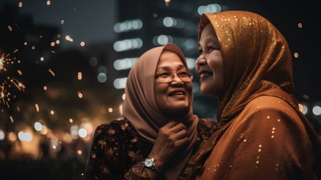 two asian muslim women in traditional clothes with sparklers at night