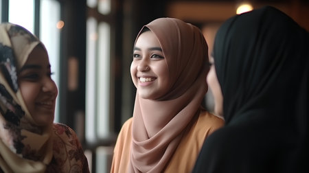Muslim young woman with her friends in the mosque. Muslim people.