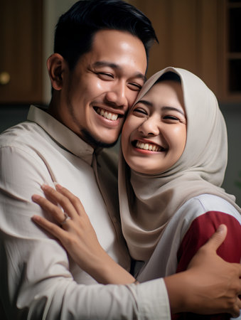 portrait of asian muslim couple hugging and smiling at home
