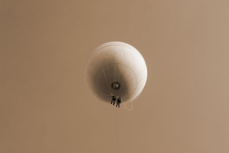 White coloured blimp, hot air airship in grey sky in rainy day nearby with vivid red Hot Air Balloon. Inflatable dirigible. Abstract modern background. With place for text