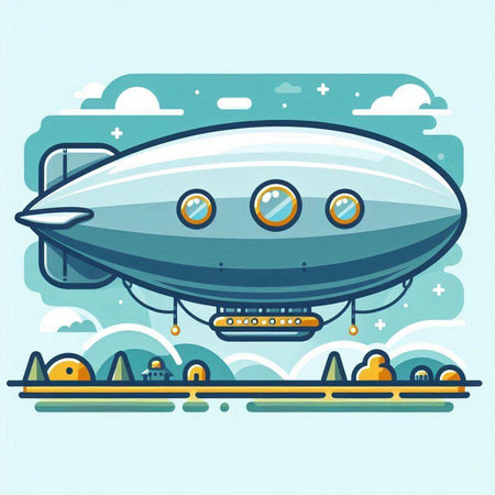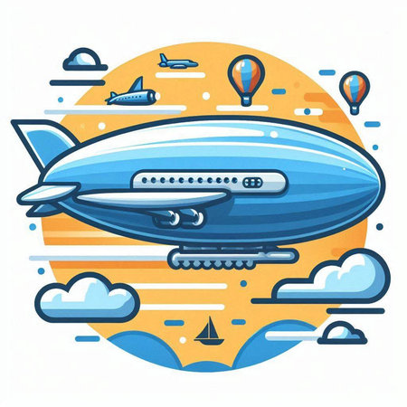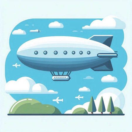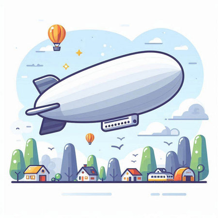 Vector illustration of an airship with a ship in the background.
