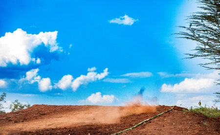 Dust erupts from the dry ground in a dynamic display indicating high energy and activity taking place in a natural outdoor setting.