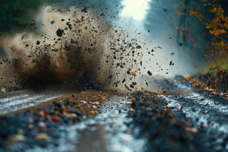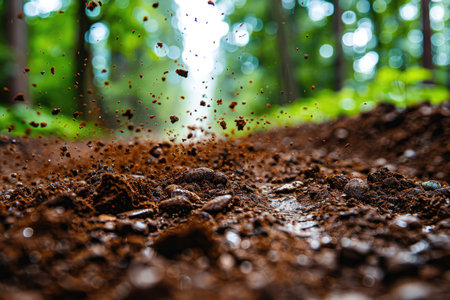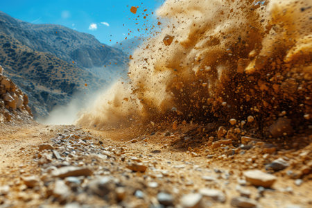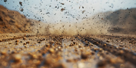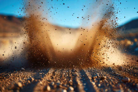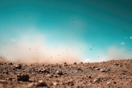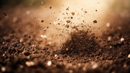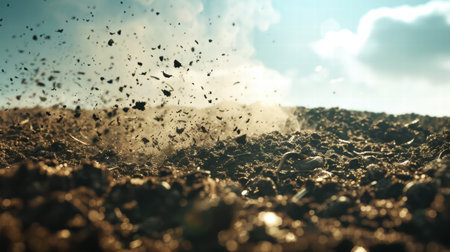 Dynamic close-up of dust and soil erupting from the ground, showcasing the raw energy of nature. Perfect for themes of agriculture, construction, and earth.