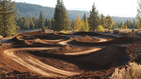 A captivating view of a dirt bike track winding through a lush forest, featuring curvy paths and vibrant autumn colors, bathed in warm golden light.