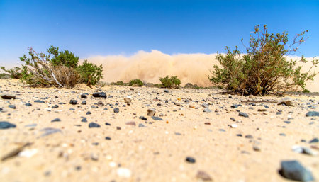 Desert Landscape Dramatic Dust Storm Rolling Hills Vivid Brown Sand dry sky sun day wind arid heat
