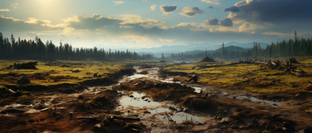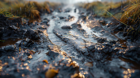 Tire tracks create a winding pattern on a muddy road after rainfall in rural landscape