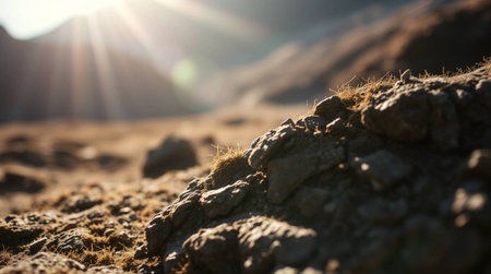 Rocky mountain landscape with sun flare. Shallow depth of field.