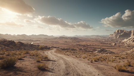 Serene winding dirt road through vast desert landscape