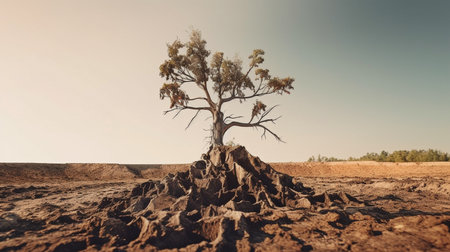 Tree outside, both living and half-dead. Conceptual image of a warmed Earth that has been devastated. The Generative AI