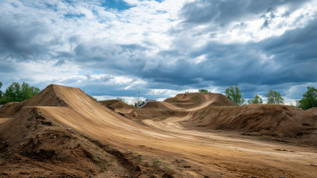 Section of the monster truck track with massive dirt ramps and clear tire marks, capturing the scale and rugged detail of an outdoor dirt racing course.