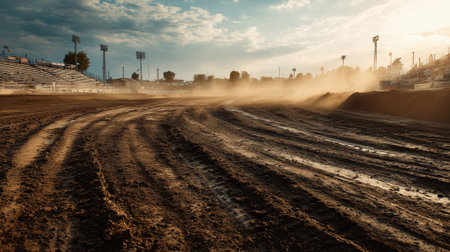Wide shot of a rugged muddy monster truck track with deep tire ruts and rising dust, empty grandstands and golden sunset lighting, capturing the raw texture and anticipation of motorsport action.