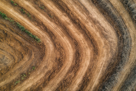 Aerial view showing distinctive soil patterns and curved lines formed by agricultural practices under sunlight.