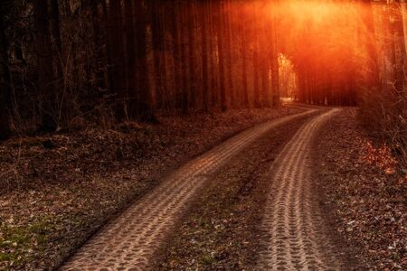 Dirt trail through the forest in the rays of the setting sun