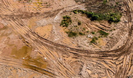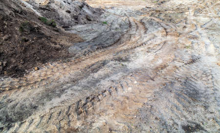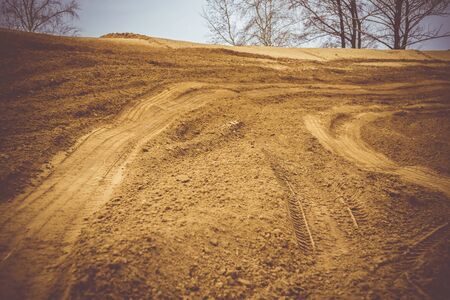 Trail of treads on a sandy quarry retro background.