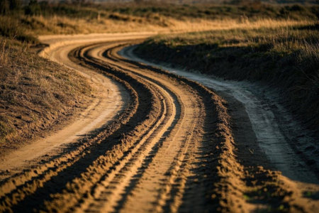 Tire tracks create a winding pattern on a muddy road after rainfall in rural landscape