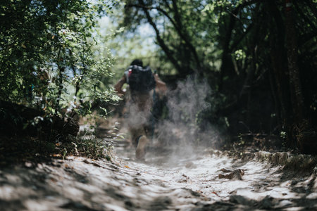 Hiker walking on a forest trail kicking up dust on a sunny day